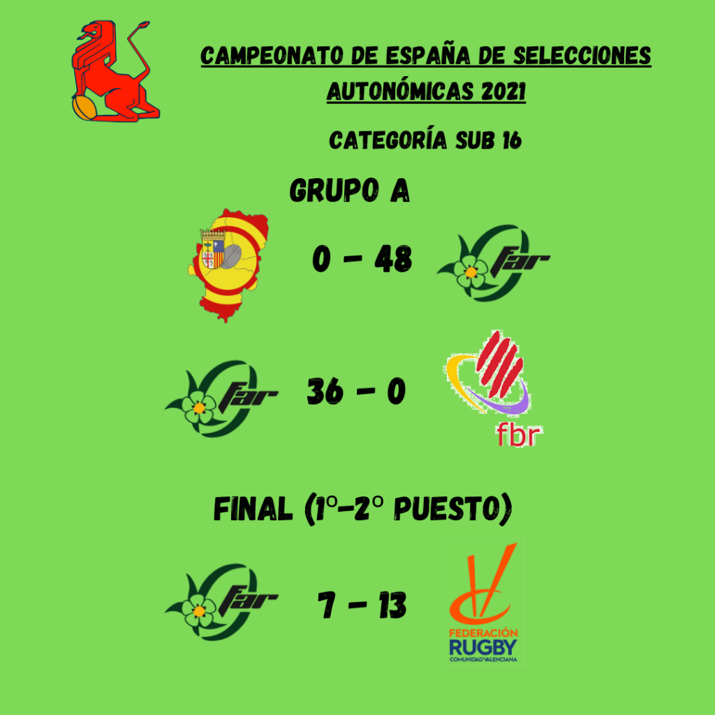 Por su parte, la categoría S16 repitió los mismos resultados que sus hermanos mayores los S18. En la primera jornada de fase de grupos, Andalucía venció por 0-48 ante Aragón y 36-0 ante Baleares, clasificándose también para la final. En el último partido, no hubo empate ya que Andalucía cayó derrotada por un ajustado 7-13 ante la Comunidad Valenciana.