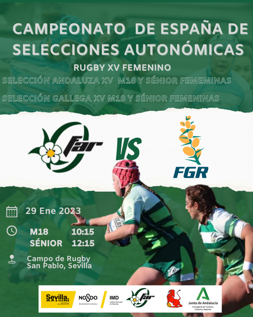 El próximo 29 de enero de 2023, se disputará los encuentros de las Selecciones Andaluzas M18 y Senior Femenino XV, participantes en el Campeonato de España de Selecciones Autonómicas, entre ANDALUCIA vs GALICIA, a las 10,15 y 12,15 horas (respectivamente), en las IMD San Pablo (Sevilla)
